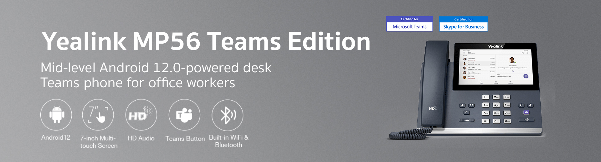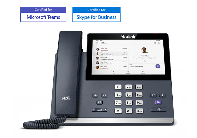 Yealink MP56 is designed for office workers. Not only features a 7-inch capacitive touch screen for rich visual presentation and easy menu navigation, the MP56 also owns a Teams-tailored user interface, a dedicated Teams button, key calling functionality, and a faster response speed. All of these provide users with convenient Teams communications and efficient office environment.