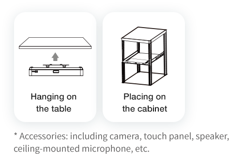 MeetingEye 800 adopts a detachable design, which supports installation and deployment such as hanging on the wall, placing on the table, hanging under the table and placing on the cabinet. Through VCH interface, the product integrates data transmission, signal control, and power supply with only one multi-function line. The accessories and the host can be connected with only one network cable, simplifying the layout of video conferencing room lines and reducing deployment costs.