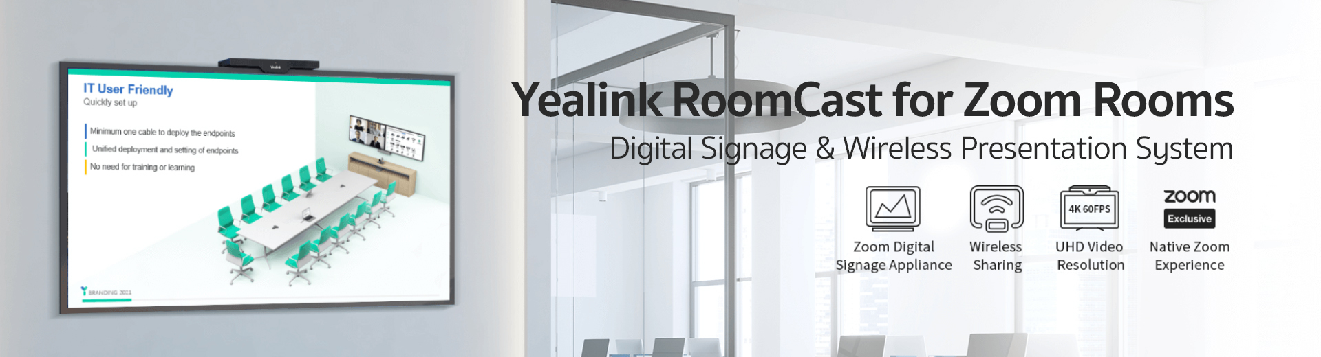 Yealink RoomCast wireless presentation system for Zoom Rooms supports 4K ultra HD Zoom's Digital Signage features to project compelling content to employees and guests.