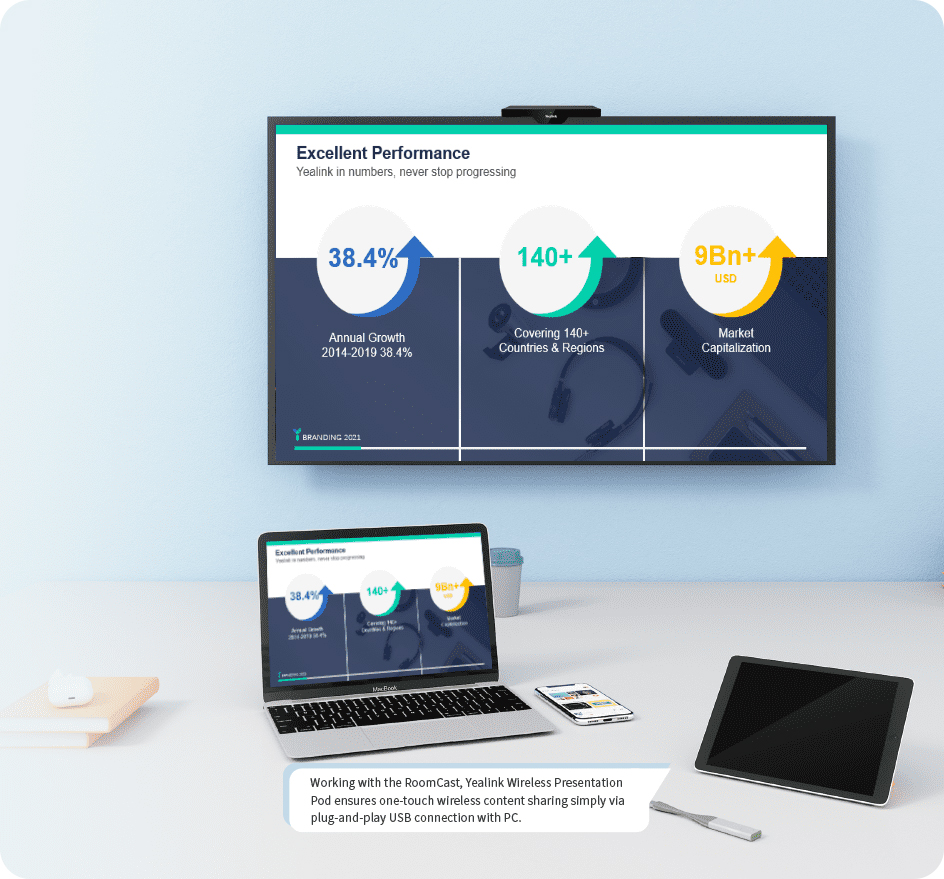 In addition to digital signage, users can realize wireless content sharing easily and enjoy one-touch sharing with Sharing Key, Yealink Wireless Presentation Pod, as well as through ultrasonic sound.