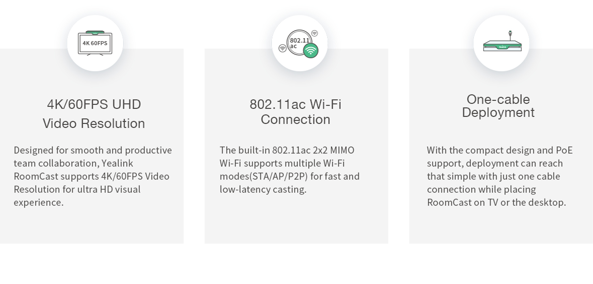 Yealink RoomCast for Zoom Rooms is easy to deploy with the highly-integrated and compact design, as well as the PoE feature and security slot. Only one cable is needed to finish the installation on the TV or desktop, making the deployment totally time- and cost-saving.