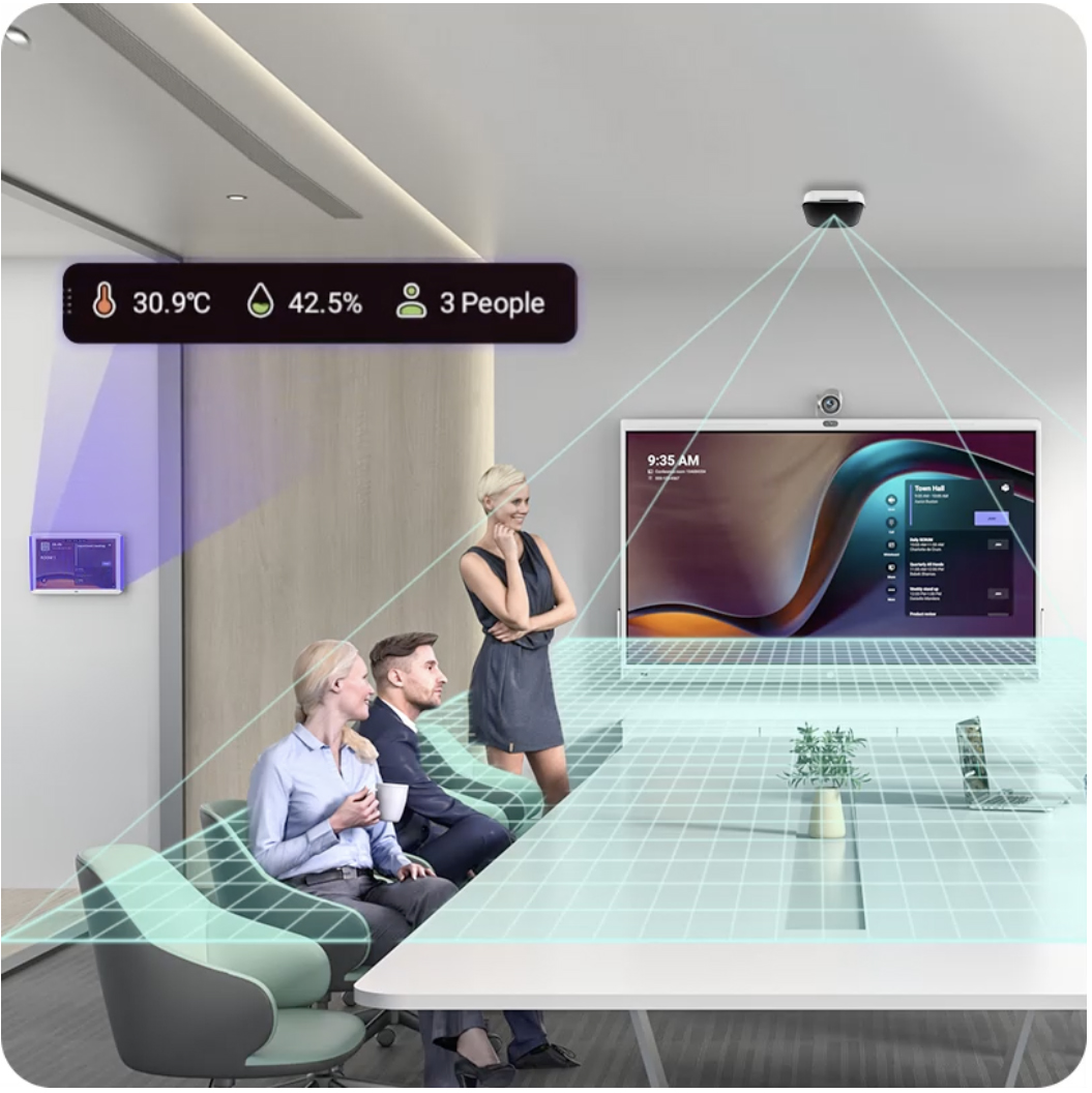 Yealink RoomSensor Pro is designed specifically for conference rooms, using Yealink's sophisticated AI algorithm to accurately count people. It also detects environmental factors such as light, temperature, and humidity, covering a wide area with high accuracy. It seamlessly connects to Yealink gateway devices* via Bluetooth, sharing data proactively. This enables intelligent strategies and works with IoT devices, creating a smarter meeting experience.