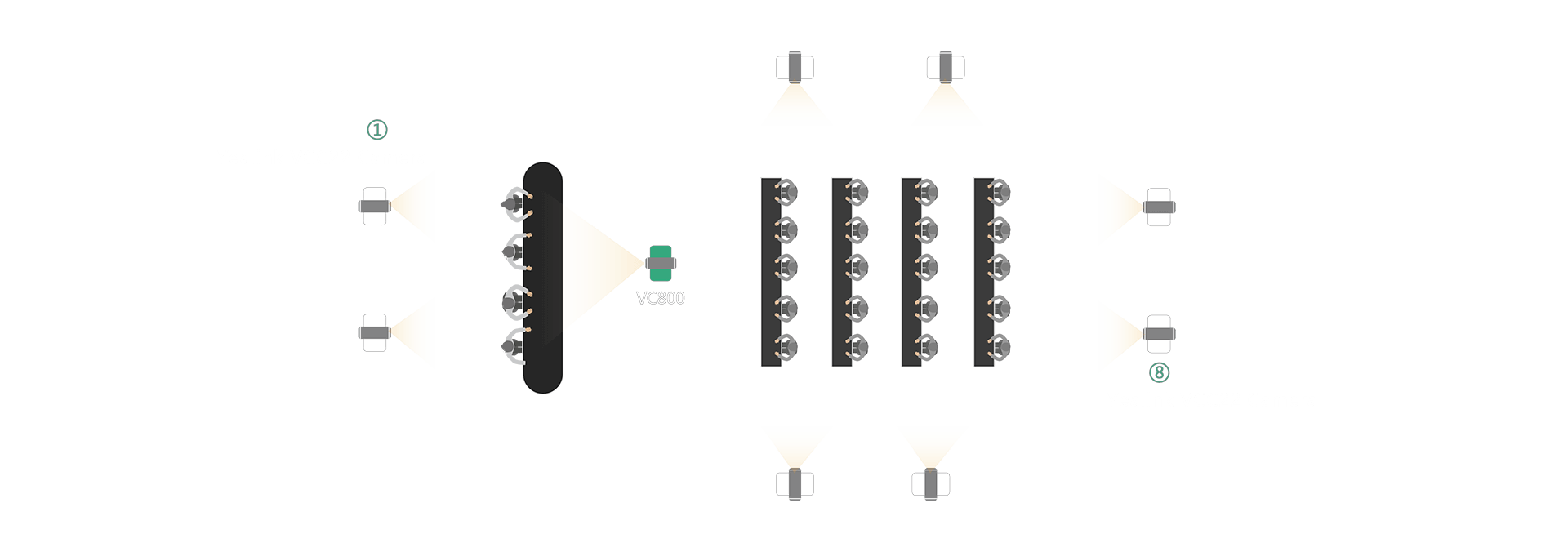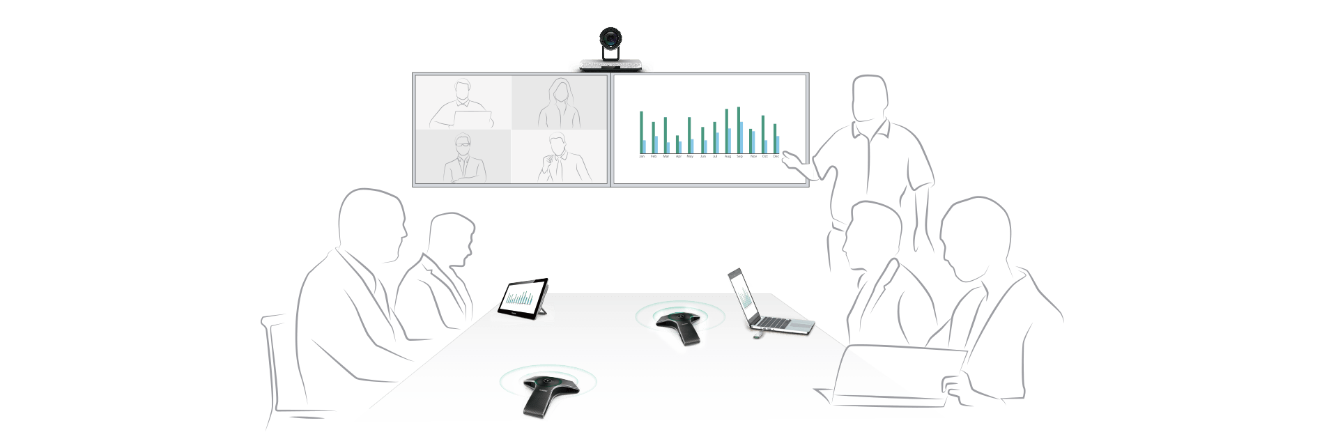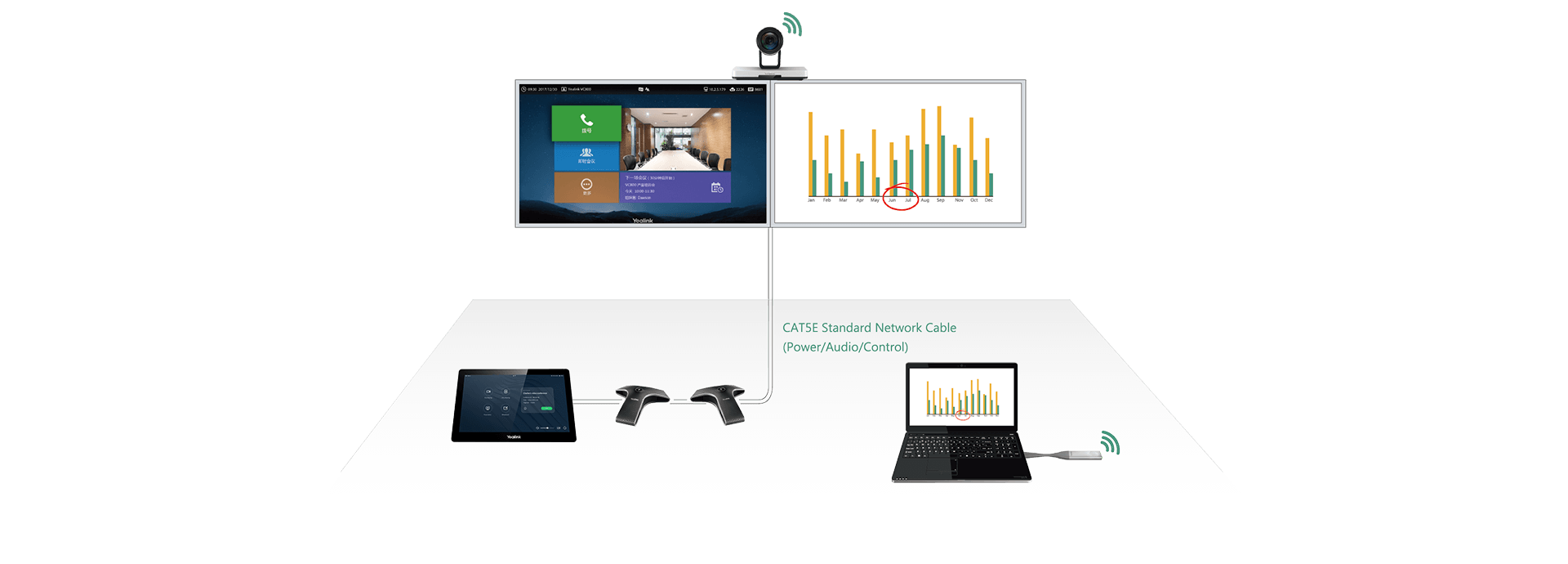 The VC800 multi-camera solution enables up to 9 cameras to work at the same time. You can control each camera separately, put all cameras in one picture, or set certain picture larger/full screen. The deployment is simple by connecting VC800 and VCC22 cameras to PoE switch only with Ethernet cables, no need for extra power supplies for VCC22, or extra video matrix.