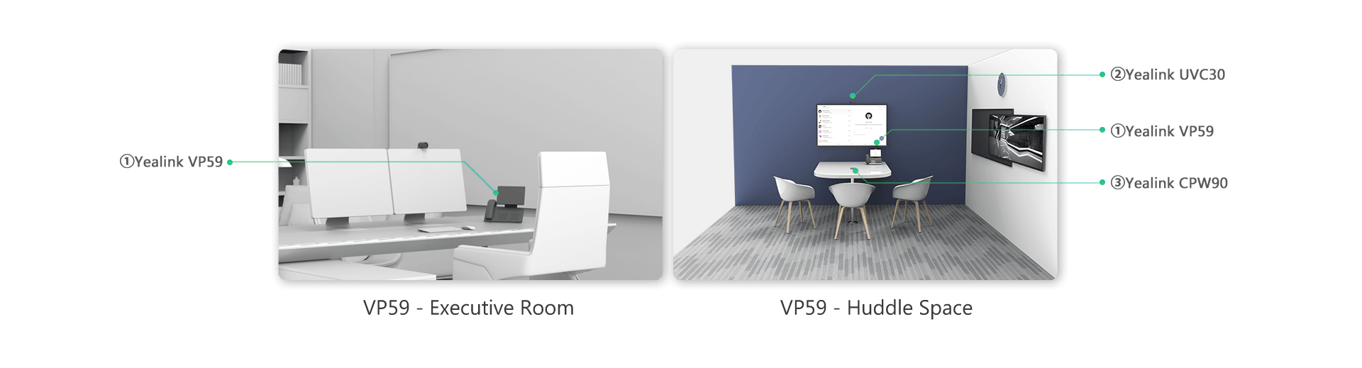 It is this page that shows the VP59 solution for personal desk. By adding on a USB camera (②Yealink UVC30 camera)