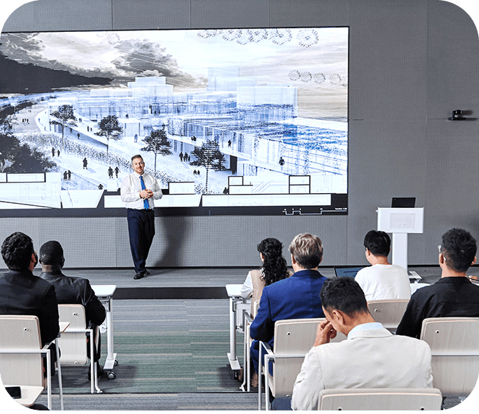 This solution caters to rectangular and curved conference tables for the Zoom room. Moreover, it effortlessly addresses the need for dividing or merging two meeting rooms, adapting to your varying space requirements. Whatever your specific needs may entail, this solution is poised to fulfill them.