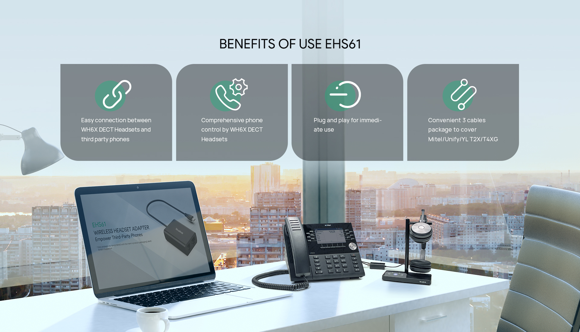 The advanced Yealink Headset Adapter EHS61 provides a technical interface between your Yealink DECT Headset and a compatible desk phone (Mitel/Unify/Poly/Yealink T2X&T4XG).