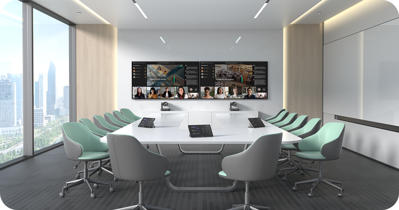 With Yealink MTouch Plus-EXT, you can deploy multiple touch panels in the same room for flexible collaboration. One MTouch Plus can extend up to four MTouch Plus-EXT units, creating a five-screen control setup. This allows participants from various areas of the room to simultaneously control cameras and switch layouts.