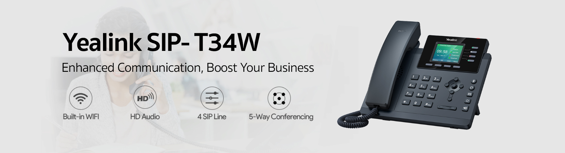 An entry-level color screen IP phone with high performance, Yealink SIP-T34W offers support for 4 lines and includes local 5-way conferencing. For its fashionable appearance as well as an extra-large 320x240-pixel color display with backlight, it brings comfortable operation experience and clear visual experience for users. With the built-in dual-band 2.4G/5G Wi-Fi, the T34W ensures you to keep up with the latest wireless technology and gain an advantage in the future wireless era. Additionally, it features a USB 2.0 port that provides seamless connectivity with Yealink wired USB headsets and Bluetooth headsets (via Yealink BT50/BT51A Bluetooth adapters). Designed with a new powerful chip, it helps greatly improved work efficiency. Additional features include a dual-port Gigabit Ethernet with integrated PoE, EHS35 support for Yealink wireless headset, and adjustable multi-angle stand support. These features allow the SIP-T34W to be a high-quality but cost-effective classic IP phone that maximizes productivity in both small and large office environments.