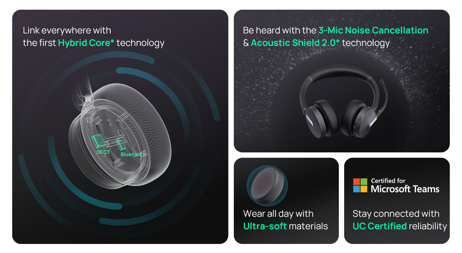 Introducing the Hybrid Core*: By integrating two cores, Bluetooth and DECT, into one headset, we‘ve combined Bluetooth’s mobility and ease of use with DECT‘s robust connectivity and extended range, ensuring an exceptional UC experience in professional environments.